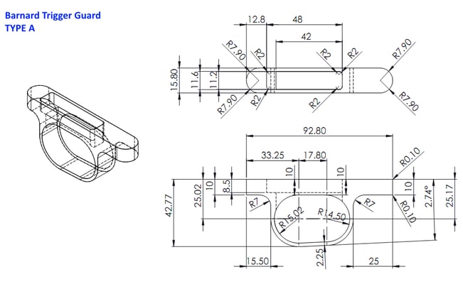 to suit a wider variety of actions and stock configurations. We produce two versions of this trigger guard, with the second version (type B) optimized for use with Jewell triggers. Metric